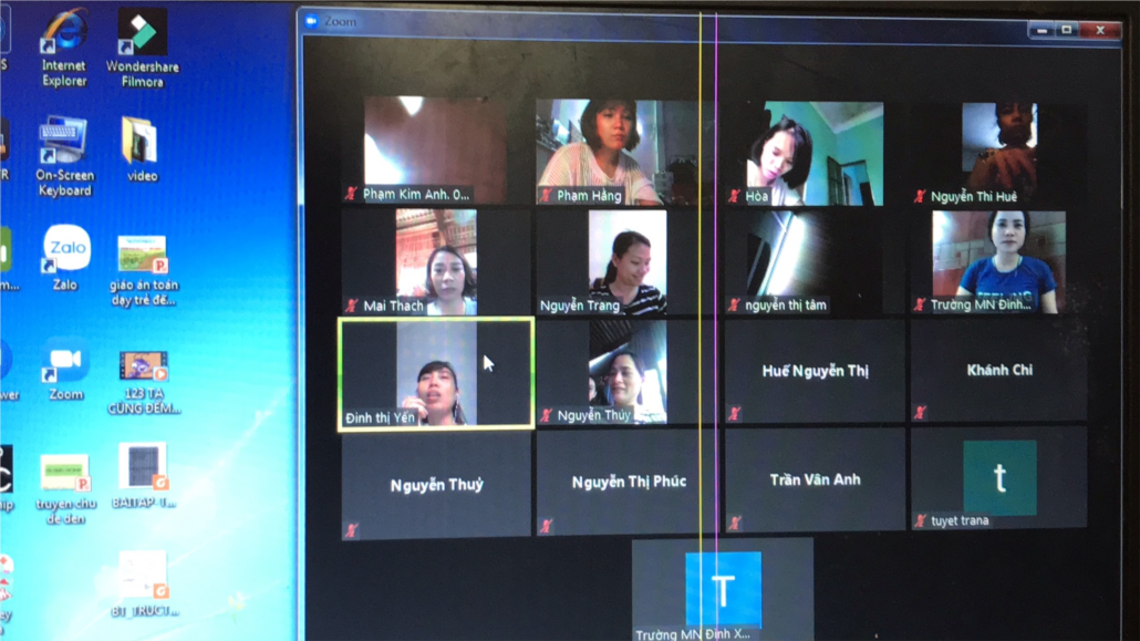15h00' ngày 21/4/2020.Tổ dạy trường mầm non Đình Xuyên tổ chức sinh hoạt chuyên môn trực tuyến trên phần mềm zoom với nội dung: Rút kinh nghiệm trong quá trình thực hiện giảng dạy online, offline; Triền khai kế hoạch thực hiện chuyên môn GD trong thời gian tới, chuẩn bị tốt mọi điều kiện đón trẻ trở lại trường khi dịch bệnh kết thúc.